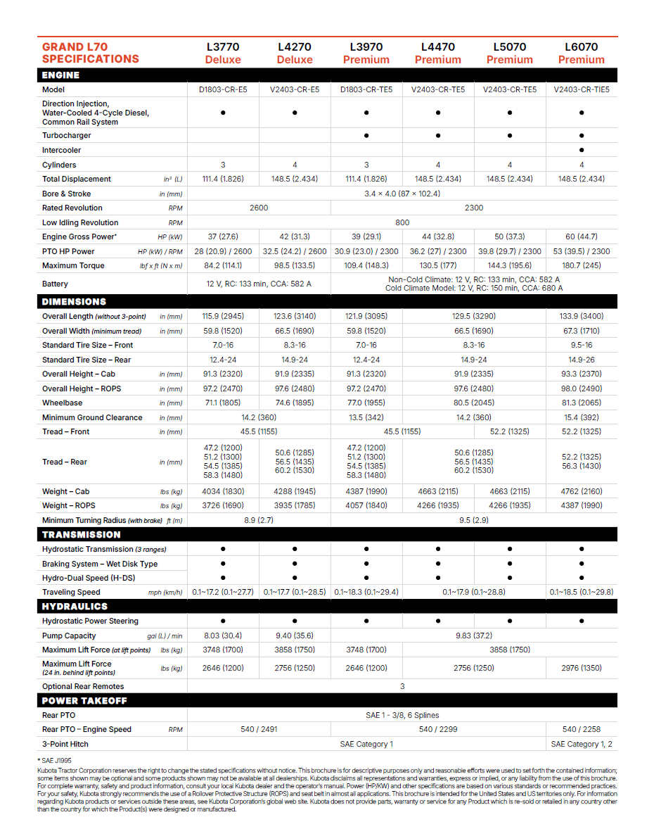 The Kubota Grand L70 series raises customers' understanding of what a compact tractor should be. Designed for people who take pride in owning their land, the Grand L70 series delivers robust performance with an engine gross horsepower range of 37-60HP. With options of Deluxe and Premium trim levels, all available in ROPS and Cab configurations, this series is tailored to meet the specific needs of residential owners and commercial operators alike, ensuring every customer finds a tractor that exceeds their expectations. #1 selling compact tractor in the USA.*